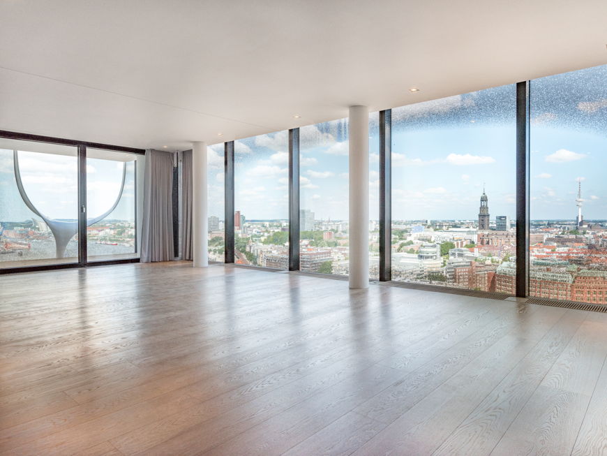 Die elbphilharmonie in der hafencity beherbergt neben den konzertsälen, eine öffentliche plaza, ein hotel, drei restaurants, 45 eigentumswohnungen und die 132 m2 große wohnung im 18.